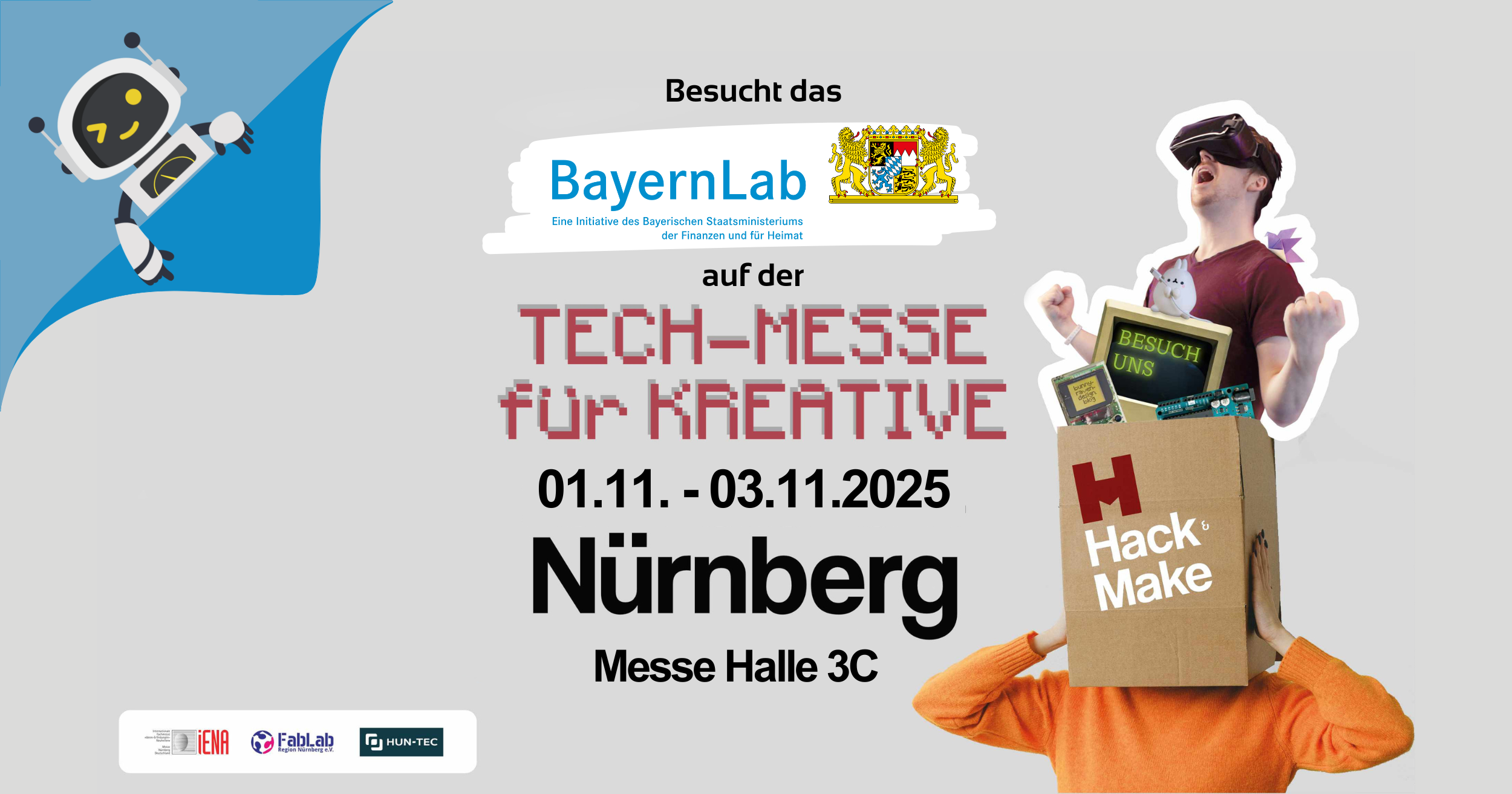 Vom 1. bis 3. November 2025 sind wir auf dem Hack & Make, dem Kreativ- und Technikfestival in Nürnberg. In der Halle 3C erwarten Besucherinnen und Besucher drei Tage voller Kreativität, Technik und Innovation – gemeinsam mit der IENA und der Consumenta.